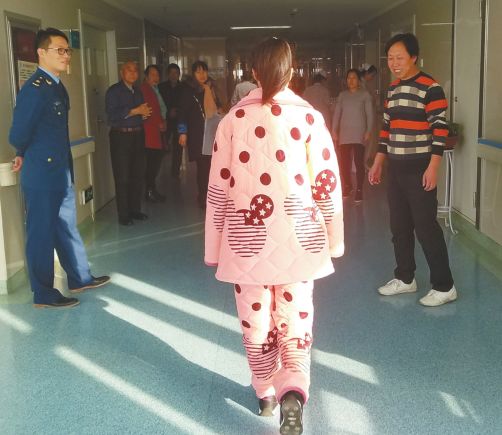 1月19日下午,在住院病房见到贺琳琳的时候,她躺在病床上和家人有说有笑。为了向大家展示手术的效果,她主动下床在病房走廊上走了一圈。大概50米的楼道,她走得小心翼翼,虽然步伐不大,但看起来和正常人走路没什么大的区别。